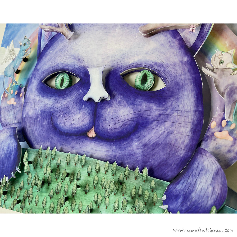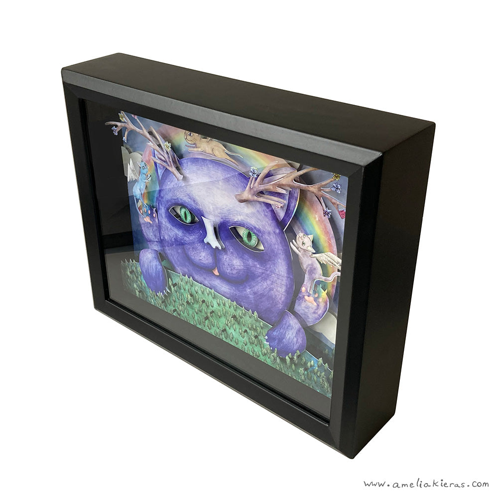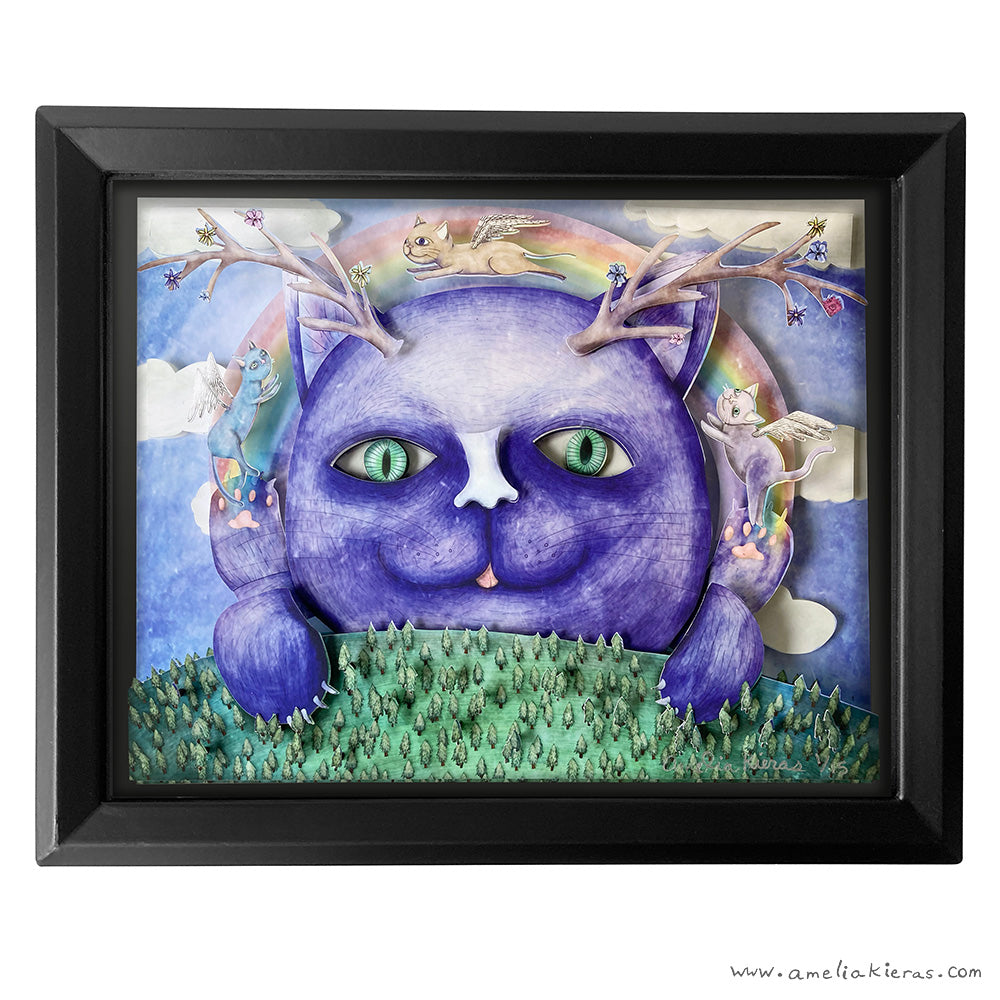 In this limited edition shadow box piece, a cat god peers down from the sky over their world, attended by cat angels flying around their head.