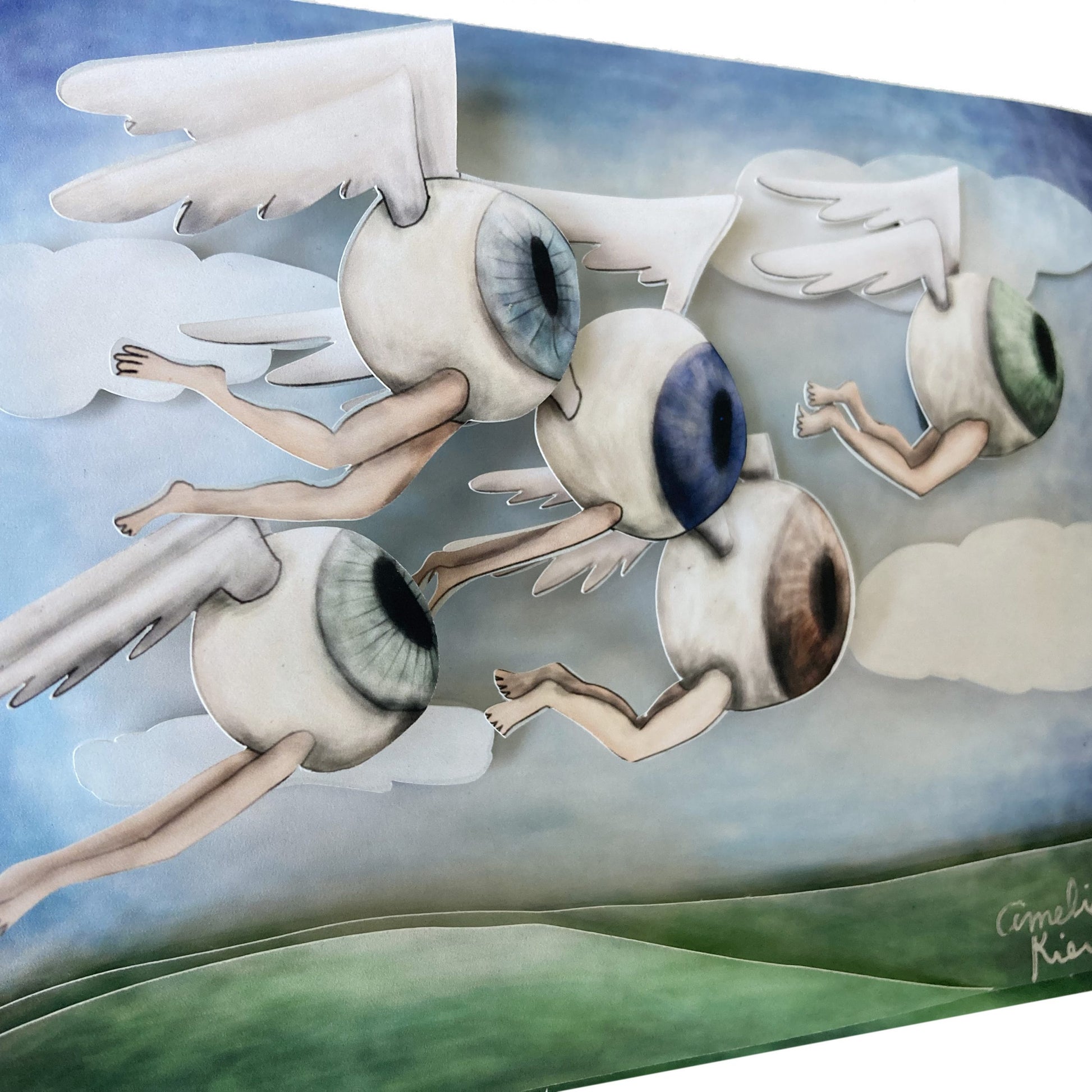 This piece is a multi layered 5x7" shadow box of one of my original illustrations. I print the layers on to a heavyweight matte paper, using archival pigment-based inks, and then cut each layer out and add supports for depth in the scene. This is part of a limited edition of 15, and is signed and numbered in the bottom right corner.