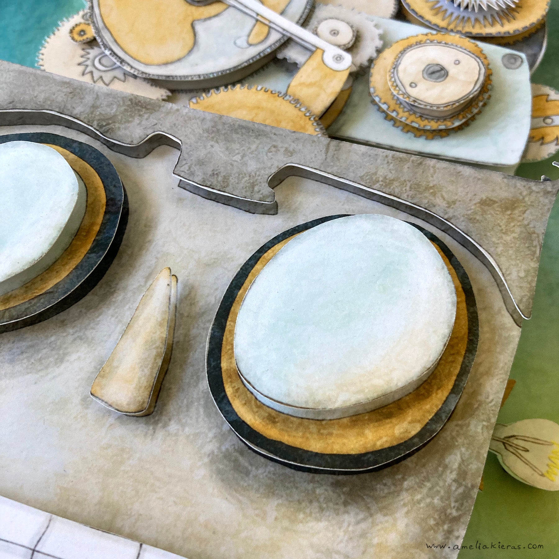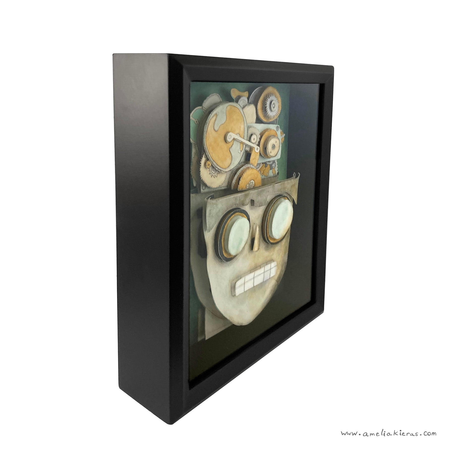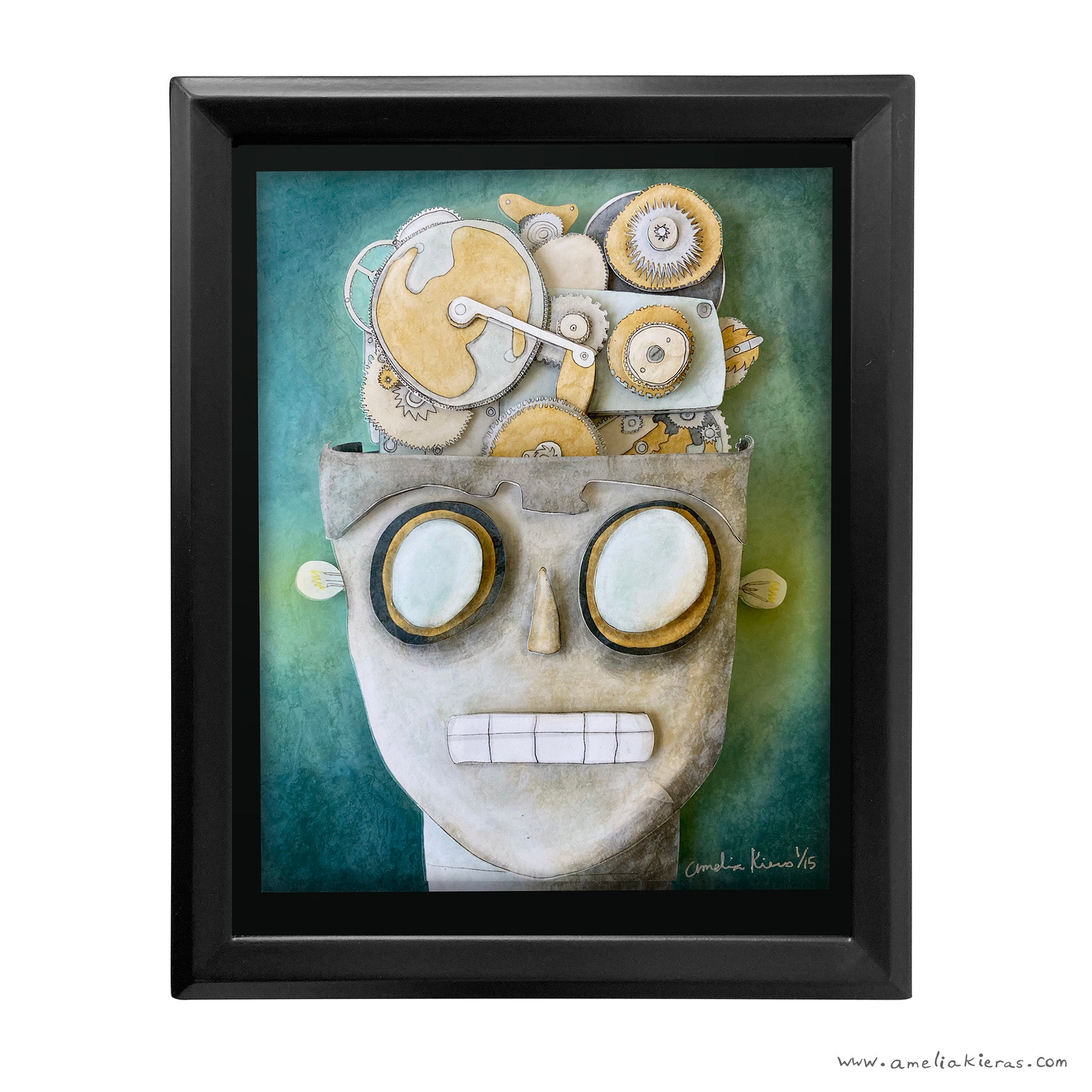 In this limited edition shadow box piece, peak inside the inner workings of a robot's brain, complete with wheels, gears, bulbs, and other mysterious machinery.